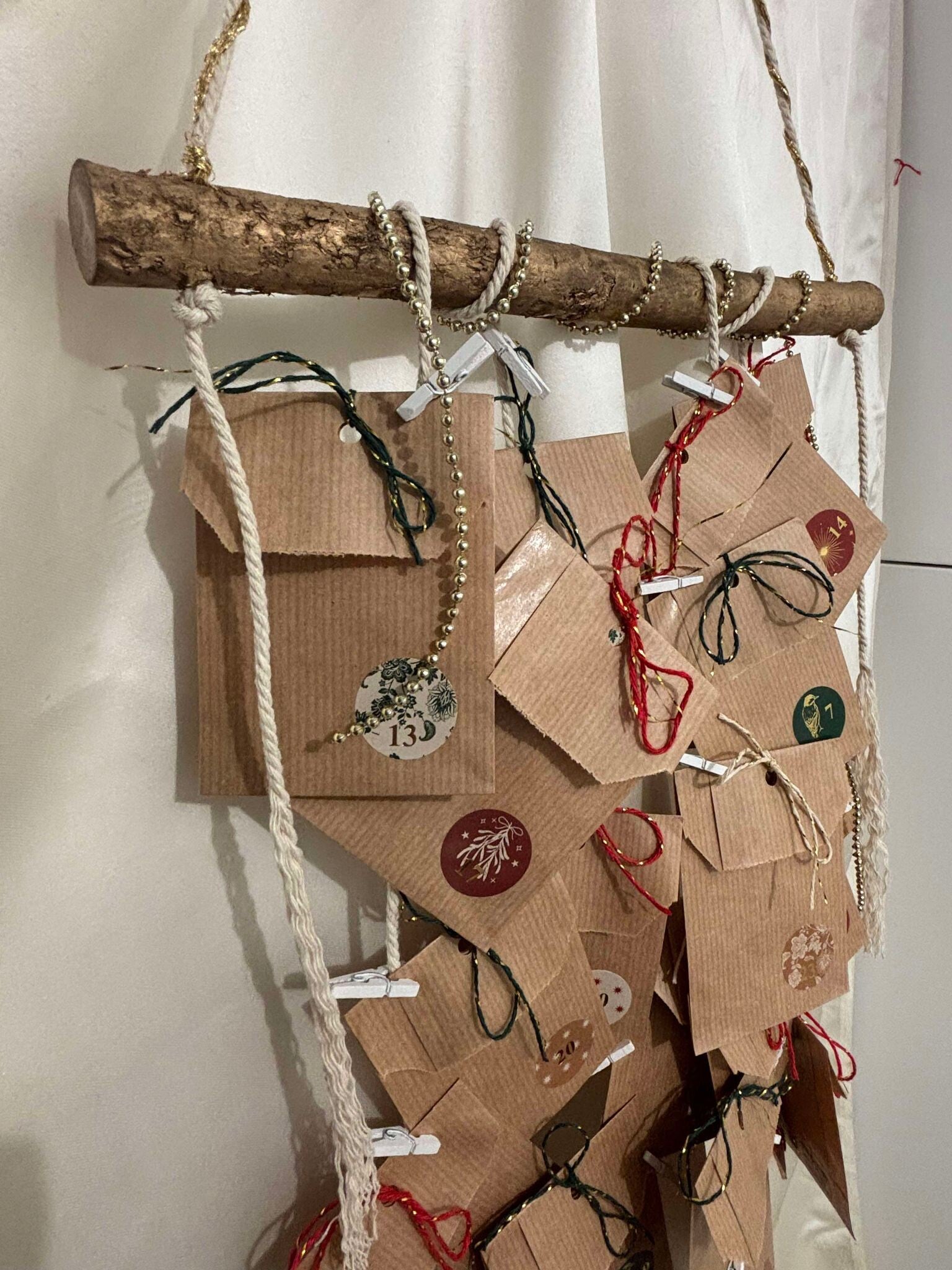 Si vous optez pour l'option avec support, il vous suffira simplement d'y accrocher vos 24 pochettes à l'aide des petites pinces en bois fournies.